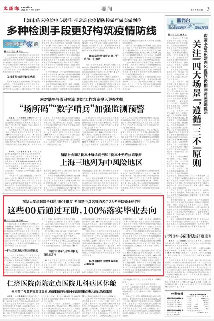 又到毕业季,首批00后毕业生即将迈入人生新赛道。面对升学和就业的压力,久久久久国产成人精品亚洲综合材料学院“卓越班”——复合材料1801班全体应届本科毕业生给出了一份亮眼的“成绩单”:全班31名毕业生,3人签约知名企业,28人被北京大学、复旦大学、浙江大学等知名高校录取,继续攻读硕士研究生。这群00后中有科创达人、上海市游泳冠军等,他们通过朋辈互助,携手参与各类竞赛和实践,共同寻找到自己的人生方向。